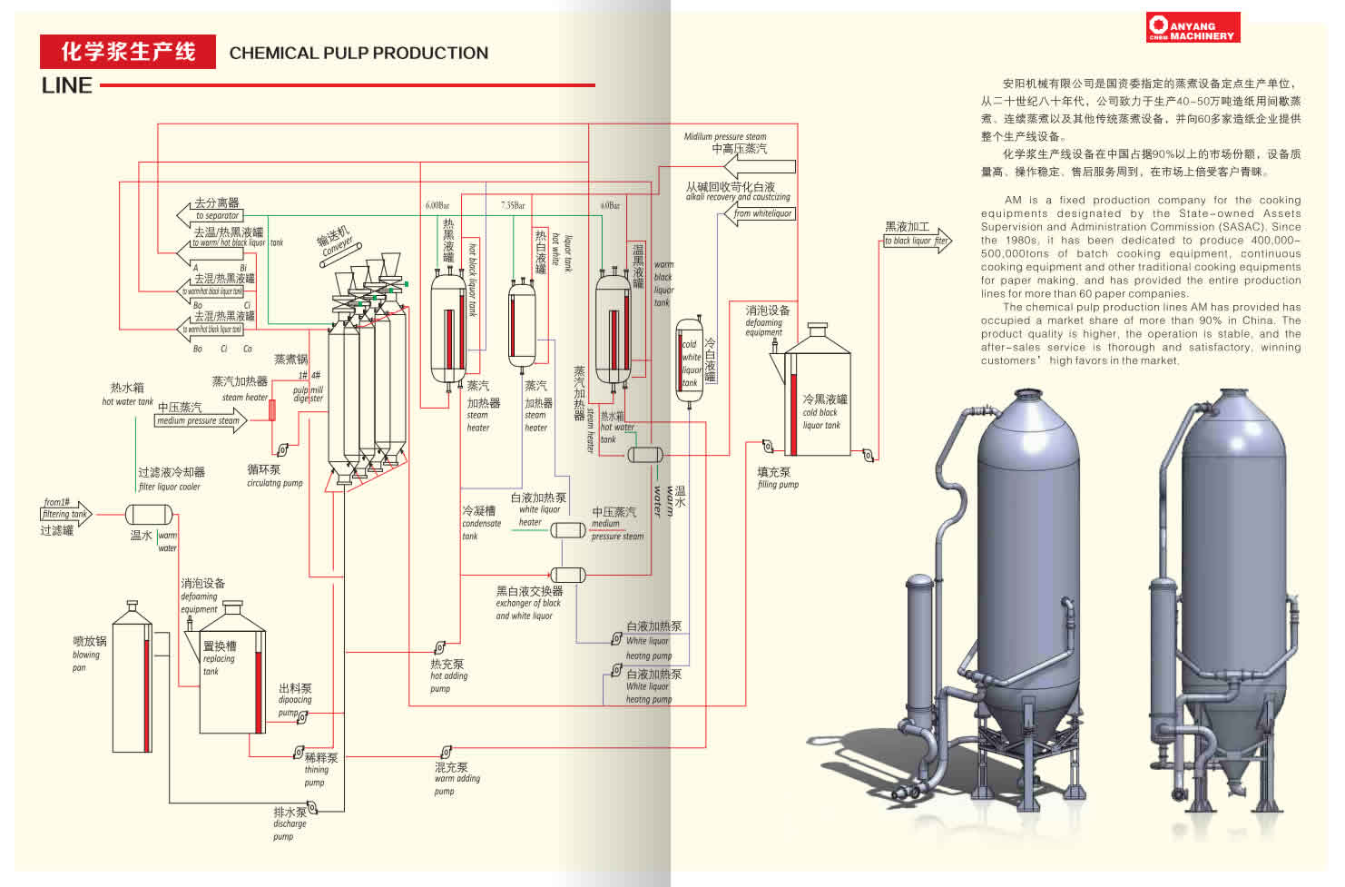 我公司為國(guó)資委指定的蒸煮設(shè)備定點(diǎn)生產(chǎn)單位,從20世紀(jì)80年代,公司致力于生產(chǎn)造紙用間歇蒸煮、連續(xù)蒸煮等設(shè)備?;瘜W(xué)漿生產(chǎn)線設(shè)備在中國(guó)占據(jù)90%以上的市場(chǎng)份額,設(shè)備質(zhì)量高、操作穩(wěn)定、售后服務(wù)周到,在市場(chǎng)上備受客戶青睞。其中,我公司自主研發(fā)的年產(chǎn)量30萬(wàn)噸的超級(jí)間歇蒸煮工藝,采用自動(dòng)化控制系統(tǒng),紙漿生產(chǎn)質(zhì)量穩(wěn)定,較傳統(tǒng)的蒸汽耗費(fèi)更少,成本大幅度降低,其紙張卡帕值更低、強(qiáng)度更高,國(guó)內(nèi)市場(chǎng)占有率達(dá)95%以上。